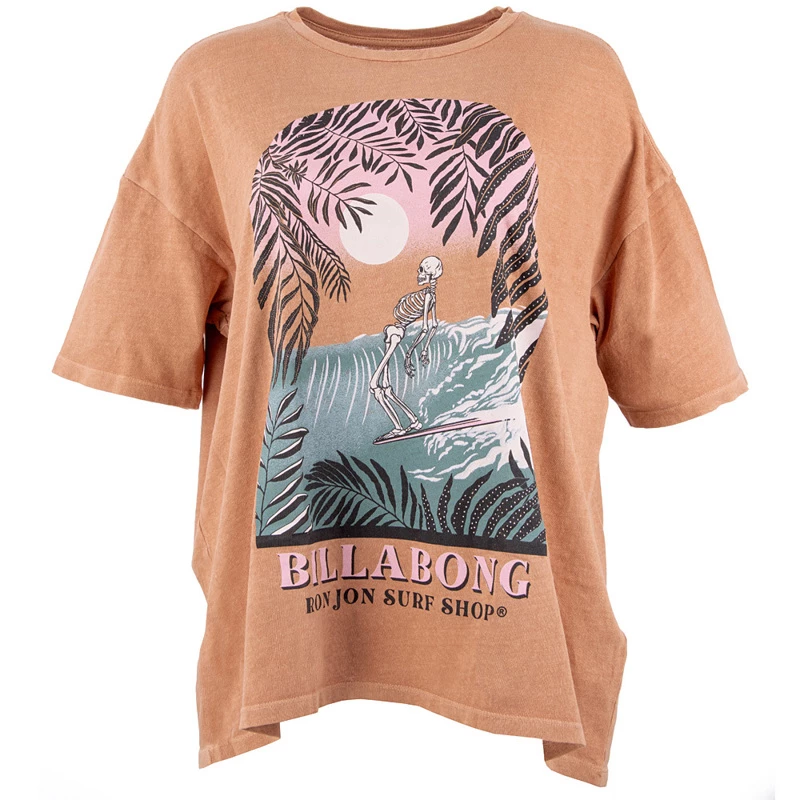 Get ready for spooky season with the Billabong Ron Jon Juniors Let It Live Oversized Tee! This fall-colored tee features a laid-back skeleton cruising through a wave on its board.