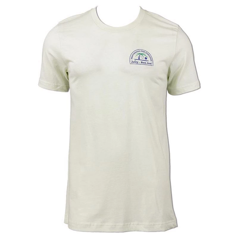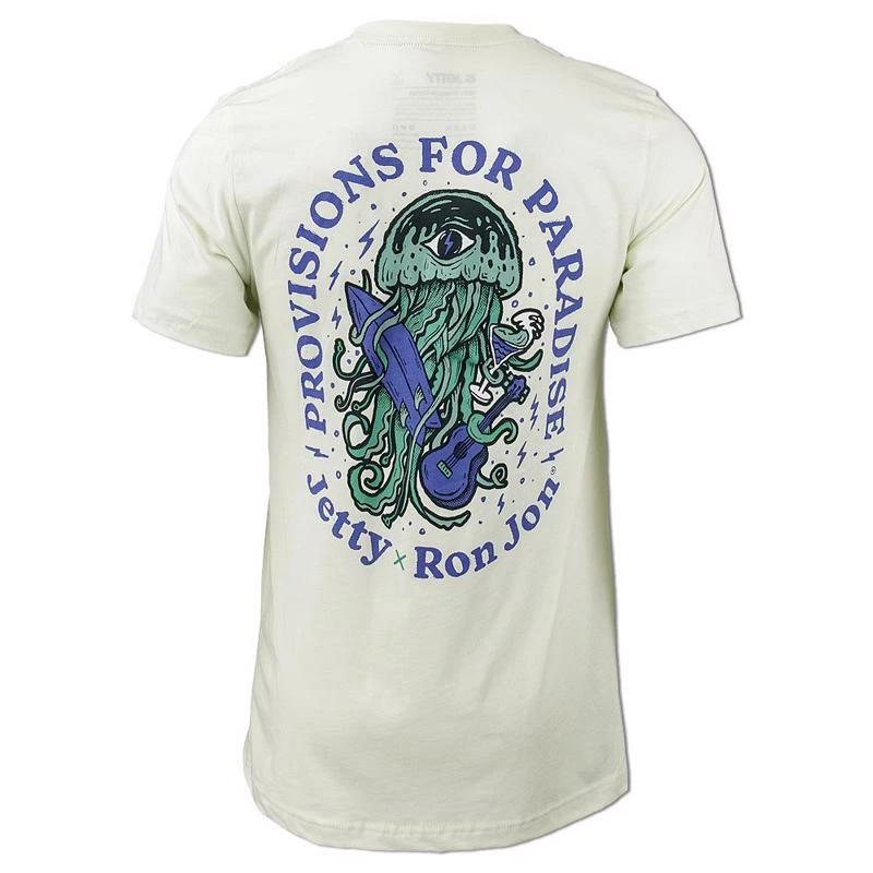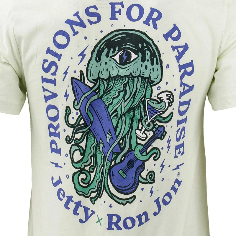 This Jetty Ron Jon Citron Jellyfish collaboration graphic tee features the words “Provisions For Paradise” and features a jellyfish with a surfboard, guitar, and cocktail.