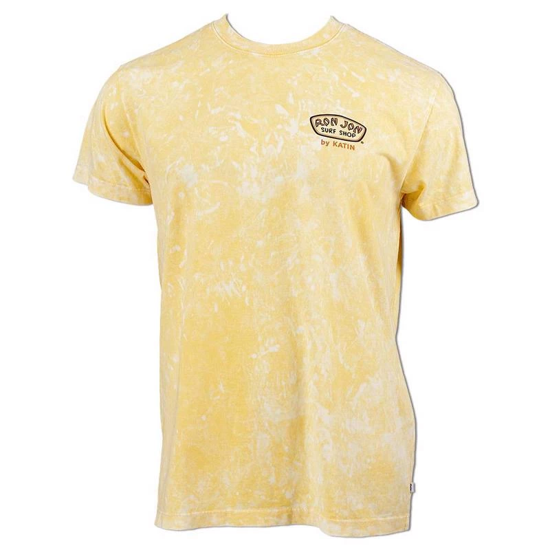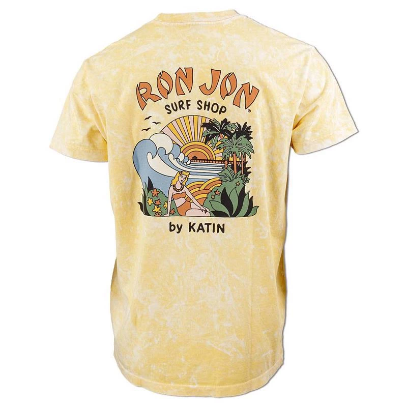 The Beach Rainbow short sleeve tee was created as a collaboration between Katin and Ron Jon Surf Shop. The artwork features a girl in a high-waisted bandeau bikini relaxing among tropical vegetation with the beach and a pier in the background. Due to the special dyeing treatment used, the mottled pattern may be more or less prominent.