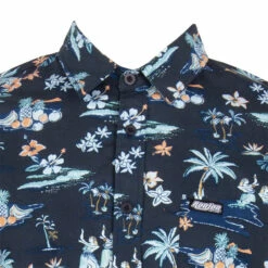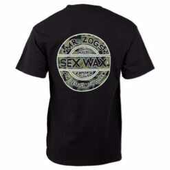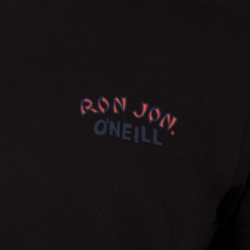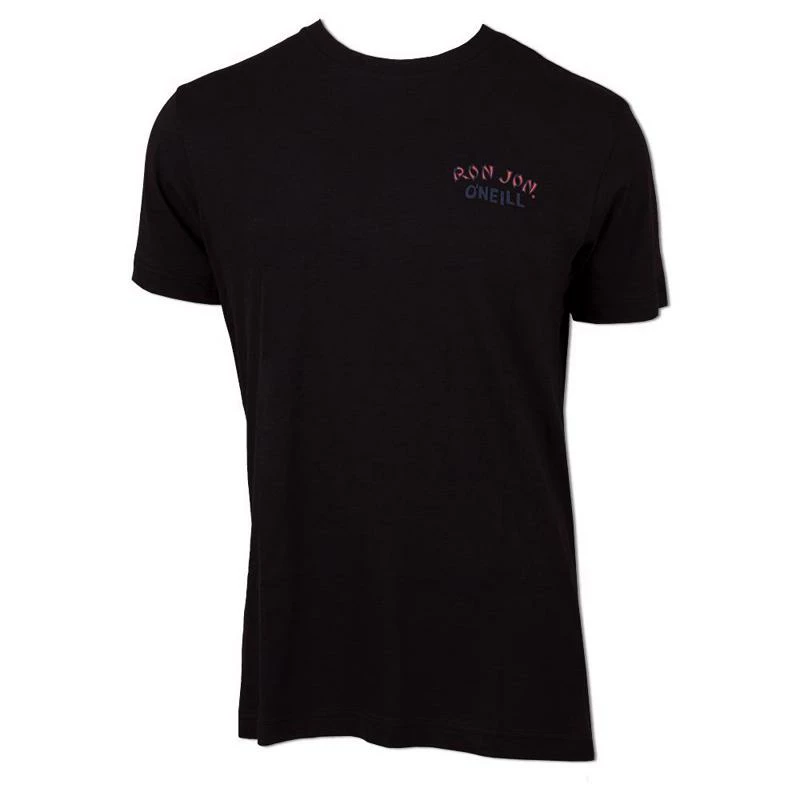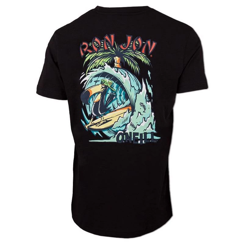 The Super Shredder short-sleeve t-shirt in black from O’Neill and Ron Jon Surf Shop, features a calm, cool bird nose riding through a tube. The Ron Jon and O’Neill names are printed on the front.