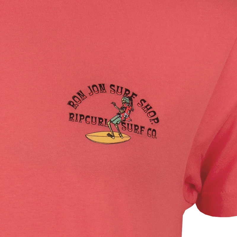 The Rip Curl Ron Jon Coral Skelly Short-Sleeve Tee features graphics of a skeleton wearing a Hawaiian shirt and boardshorts riding a surfboard. Both companies’ names are included in the graphics.