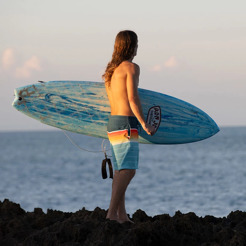 The colorful Ron Jon Aruba Blue Kalama Boardshort is a great option for any beach party this summer. The fabric almost mimics a sunrise or sunset setting over the water with its assortment of reds, yellows, and blues.