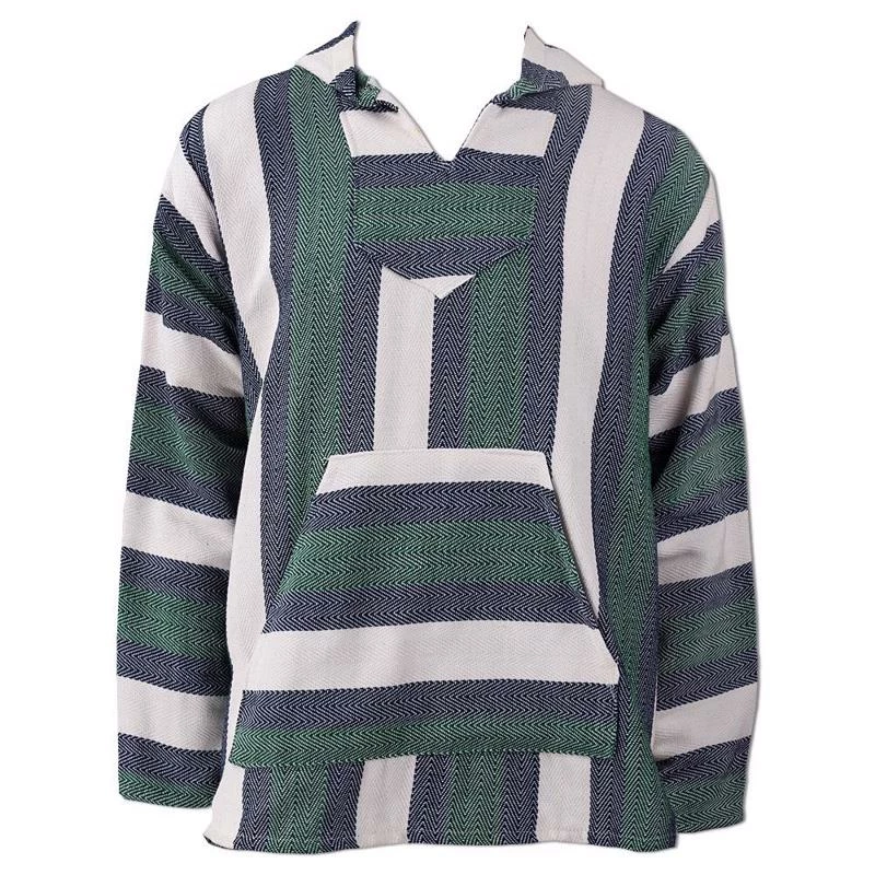 The Ron Jon Cotton Blend Teal Baja features a hood and a front pouch pocket with a fuzzy interior to keep your ears and hands warm.