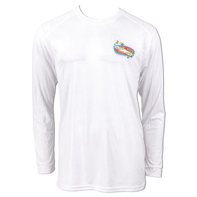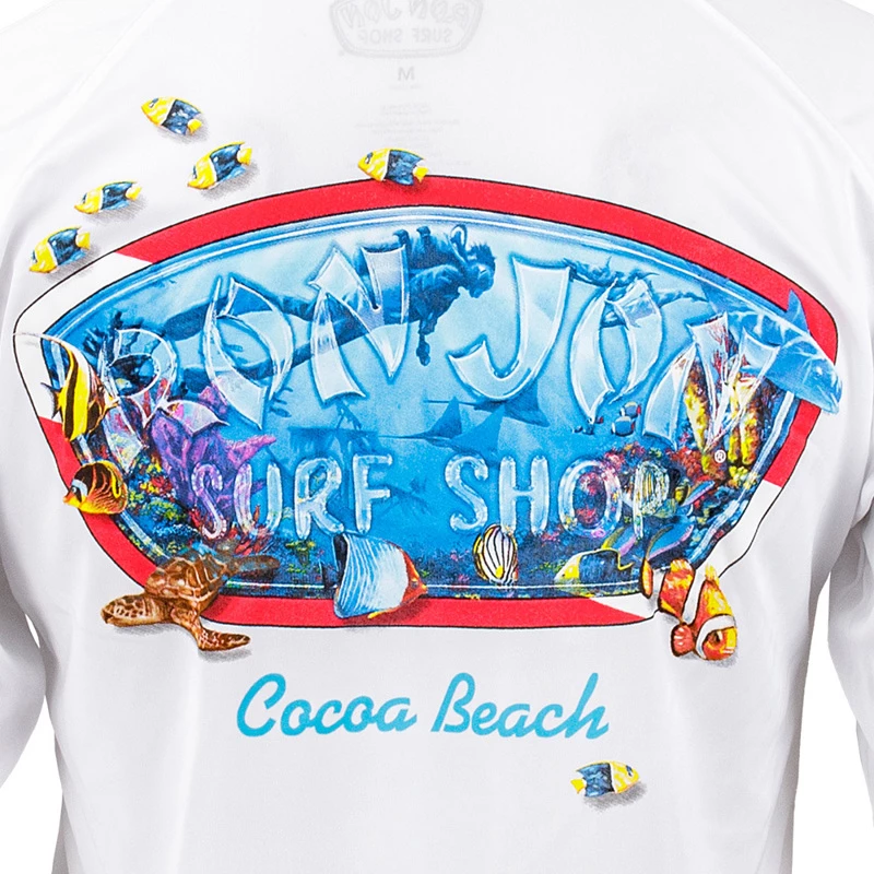 Ron Jon Dive Badge Long Sleeve Sun Shirt features an underwater dive scene complete with fish and a turtle. The special performance fabric features wicking technology that transfers moisture three times faster than normal performance tees and also offers a UPF rating of 50+ to help protect you from harmful solar rays.
