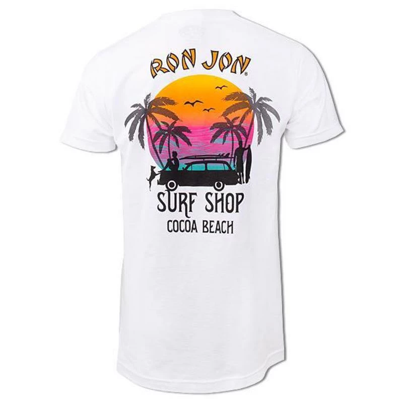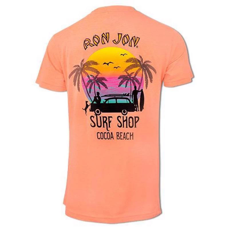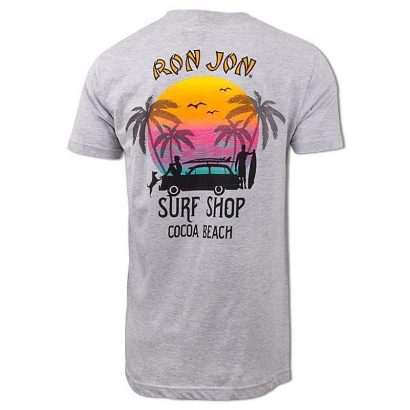 Do you love bringing your whole family to the beach, including your furry four legged family member? Then the Ron Jon Dog And Car Tee is the perfect tee to remind you of those great memories in life! It features a brightly colored graphic of a silhouetted family with their dog and a classic woody topped with surfboards. Behind the family is a beautiful sunset on the beach.