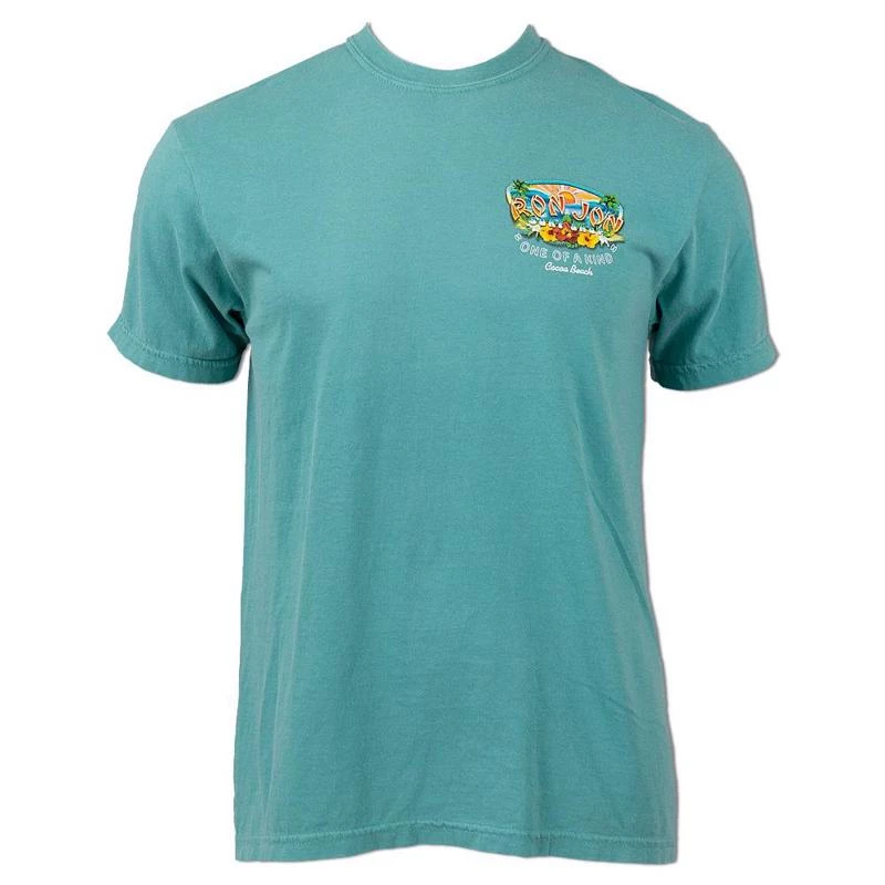 Ron Jon Hippie Waves V2 short sleeve cotton tee shirt features updated brightly colored graphics. Artistic wave with a sunburst behind it and floral embellishments inside a Ron Jon logo shape. Includes Ron Jon Surf Shop One Of A Kind Cocoa Beach Fla. lettering.