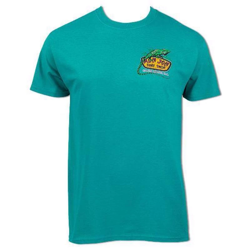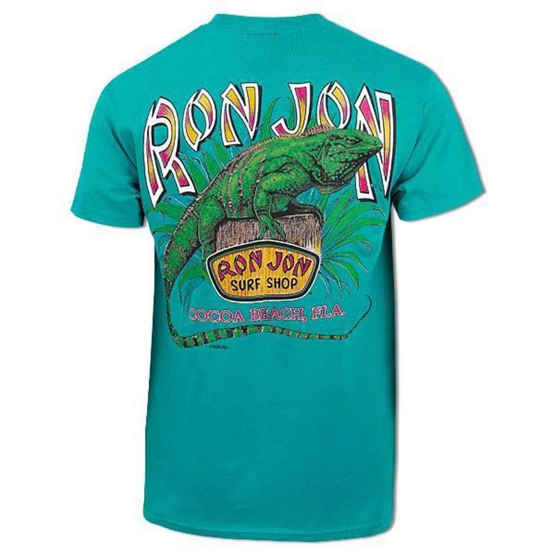 Iguanas can be found in Florida, they can grow up to 6 feet long, and they worship the sun, just like the people that flock to Florida every year for a tropical escape! The Ron Jon Iguana Tee features “Ron Jon” lettering above a green iguana that is perched over a tree trunk and surrounded by palm fronds. Below the iguana is the Ron Jon logo.