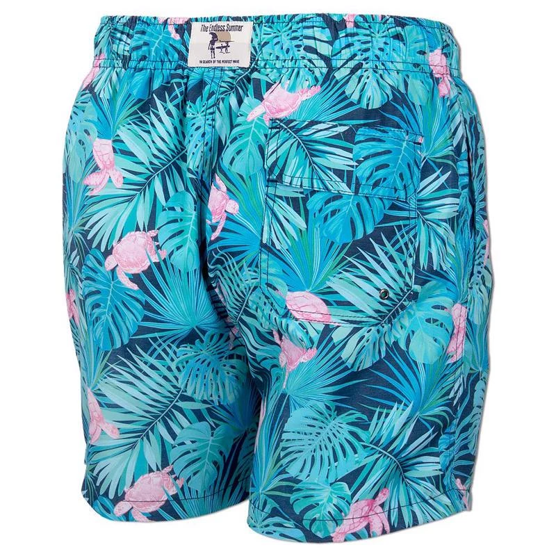 The Ron Jon Into The Night Swim Volley is a classic style men’s swimsuit from The Endless Summer® apparel line. The print on these men’s swim volleys feature a variety of tropical palm leaves with pink turtles swimming among them, in almost a dreamlike scene. Includes two front side slash pockets with mesh for drainage, and one patch style back pocket with drain grommet.