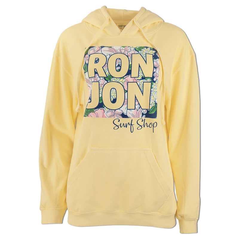 The Ron Jon Juniors Floral Knockout Pullover Hoodie is a vibrant hoodie, perfect for the chilly days in spring. It features the words Ron Jon in bold font with a pretty floral background.