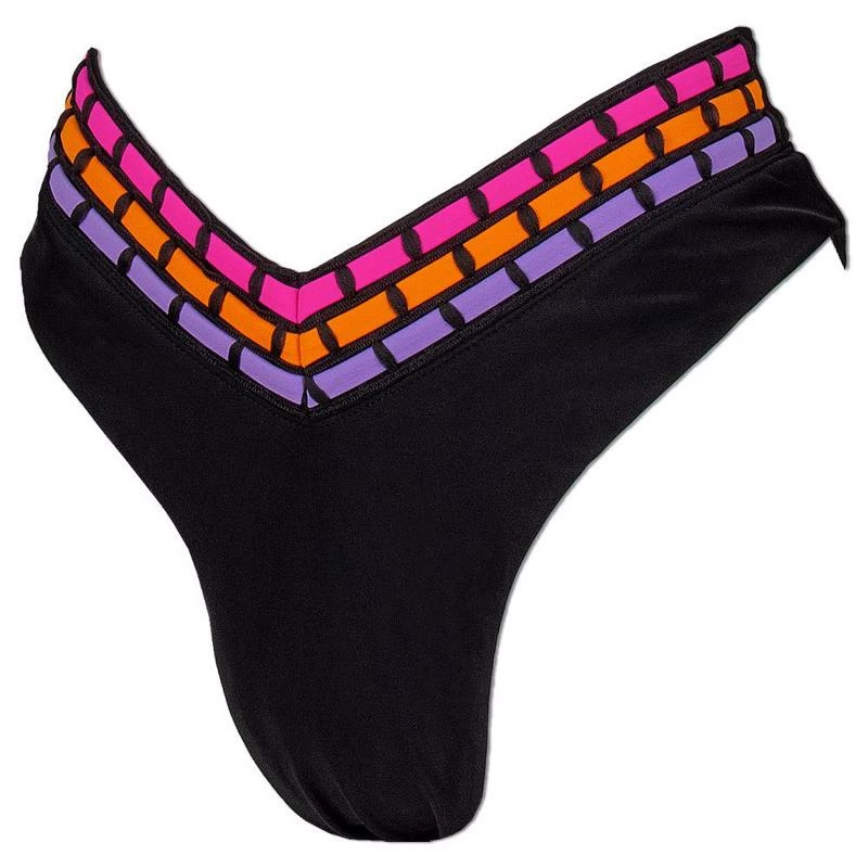 The Ron Jon Juniors Fuego High V Bikini Bottom features a V-shaped waistband, high thigh cuts, and cute neon woven stripes in the waistband.