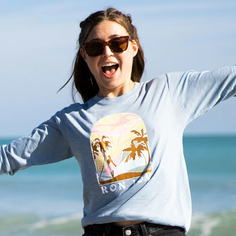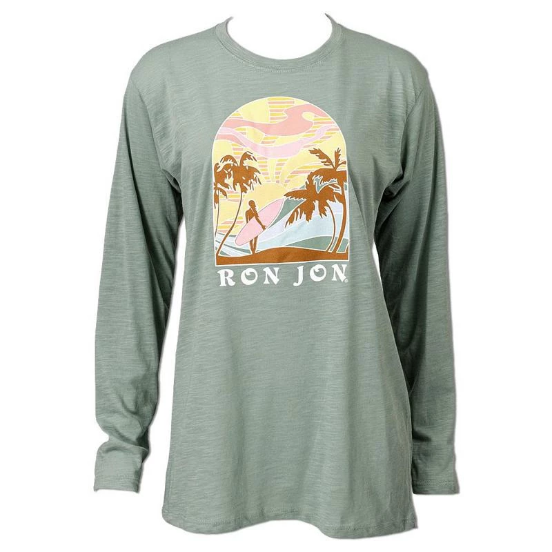 Light weight and great for layering! The Ron Jon Juniors Retro Surf Slub Long Sleeve Tee features a surfer girl screen print graphic.