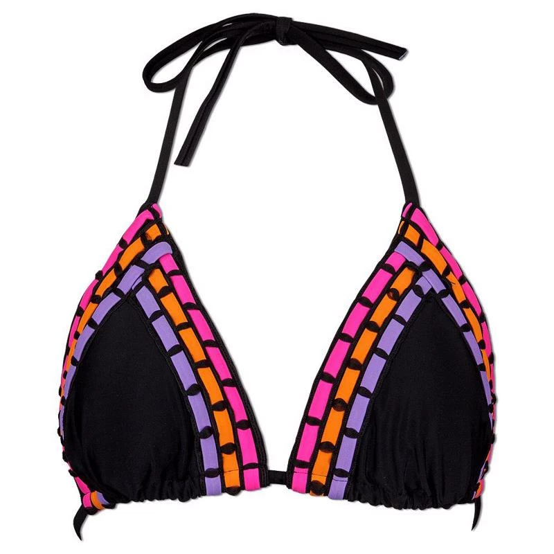 The Ron Jon Juniors Slide Tri Monterrico-Fuego Bikini Top is a standard triangle style bikini top with fixed top point and adjustable base.