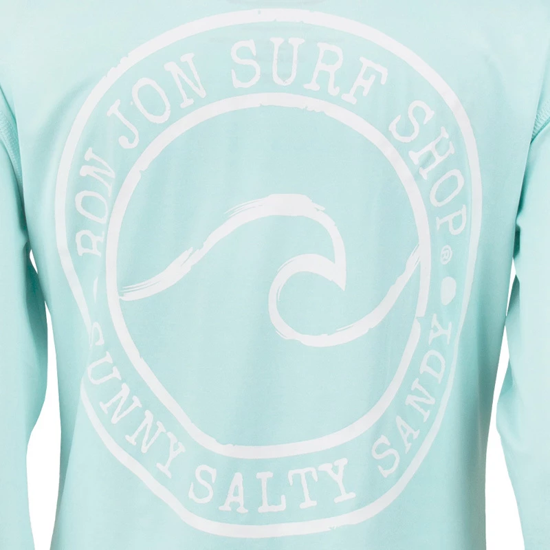 The Ron Jon Juniors Sunny Salty Sandy Long-Sleeve Sun Shirt is a great option as a swimsuit cover-up or as a top to wear while running your daily errands. The performance material offers sun protection with a UPF 50+ rating. Circular graphic with a cresting wave and Ron Jon Surf Shop Sunny Salty Sandy lettering. Large graphic on the back, a smaller version on the front.
