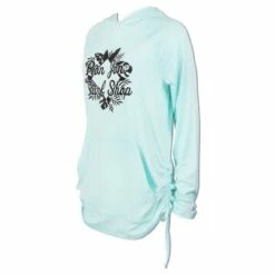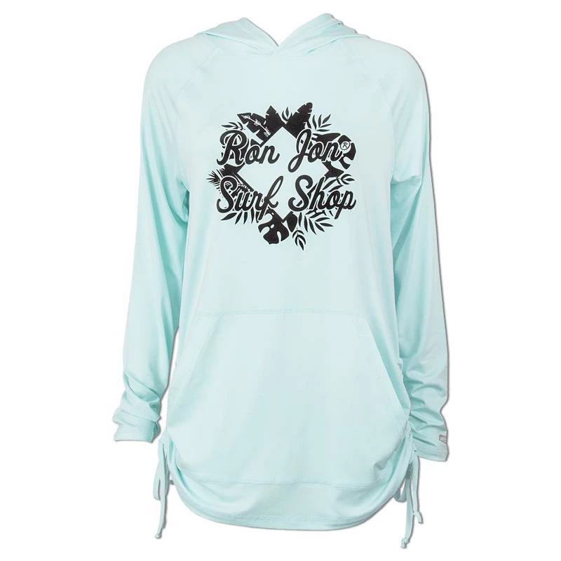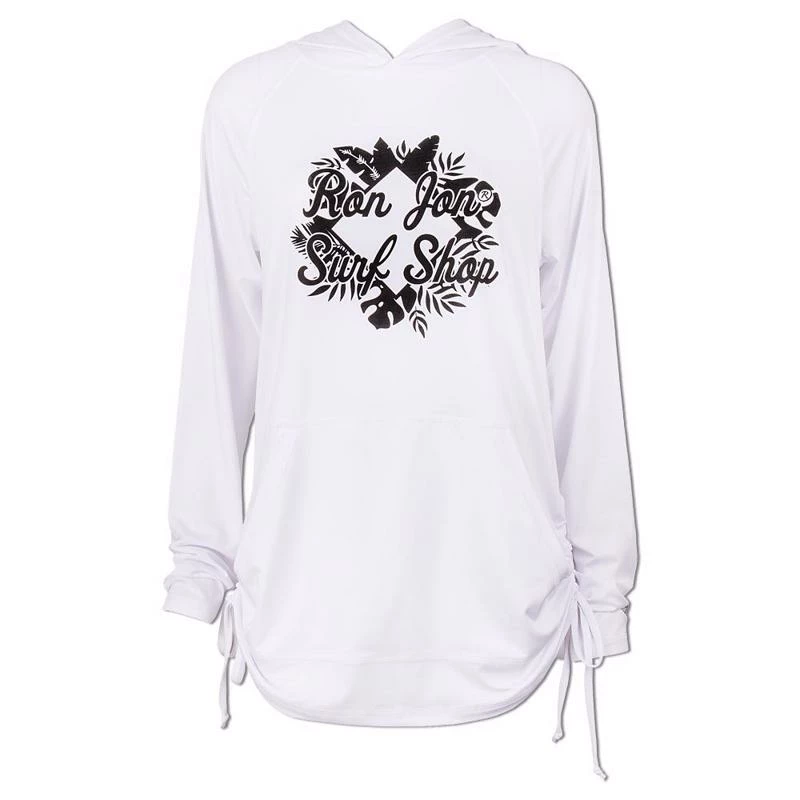 The Ron Jon Juniors Tropical Cinch Hoodie Long-Sleeve Sun Shirt offers UPF 50+ protection from the sun’s UV rays with the added flair of being able to cinch up the sides of the pull-over top. Features a palm leaf graphic pattern with Ron Jon Surf Shop lettering on the front.