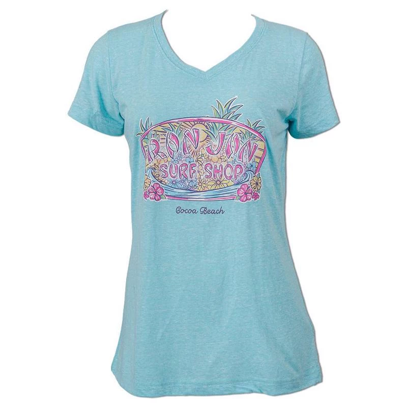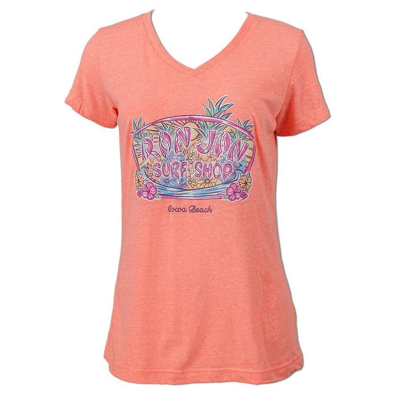 Ron Jon Juniors Tropical Sunrise tee is bursting with color. The design features pineapples, flowers and a yellow sun.