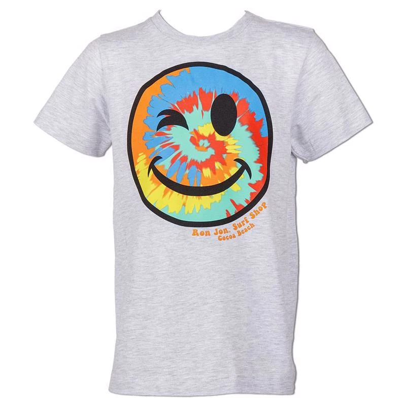 The Ron Jon Kids Tie-Dye Smiley Tee is a short sleeve t-shirt in a youth cut. It features a colorful tie-dye graphic on the front of a winking smiley face.