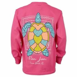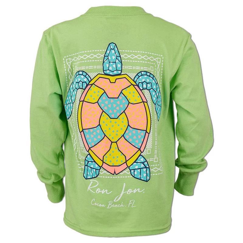 Ron Jon Kids Turtle Splash Long Sleeve Tee features neon colored screen printing on neon colored fabric. The turtle really stands out on this t-shirt.