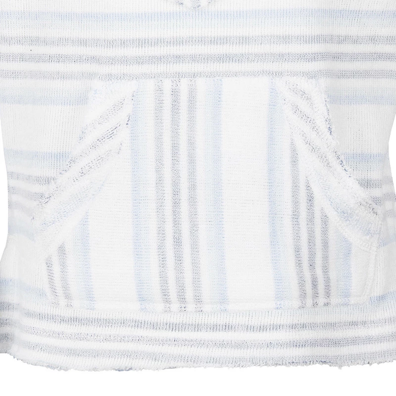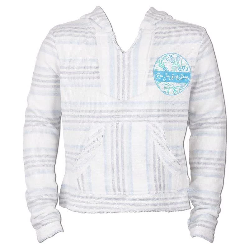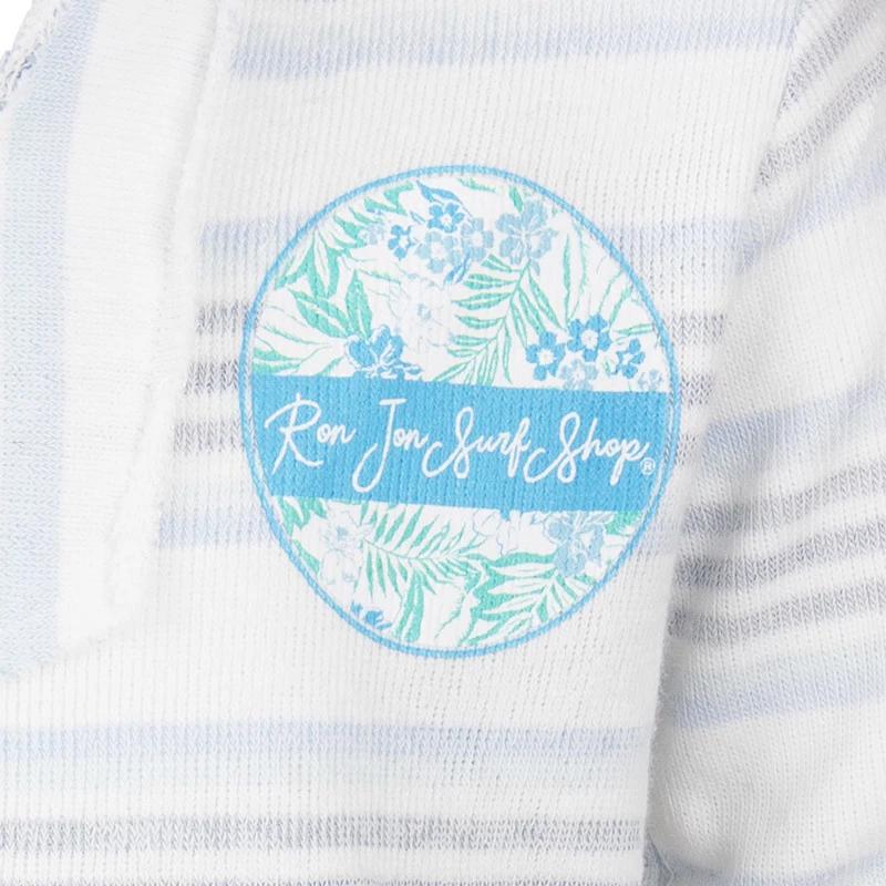 The Ron Jon Kids Waterfront Terry Baja Pullover is a great lightweight option for those cool breezy days on the beach. This pullover has a towel-like feel, a front pouch pocket, and a floral graphic on the chest with the words Ron Jon Surf Shop within it.