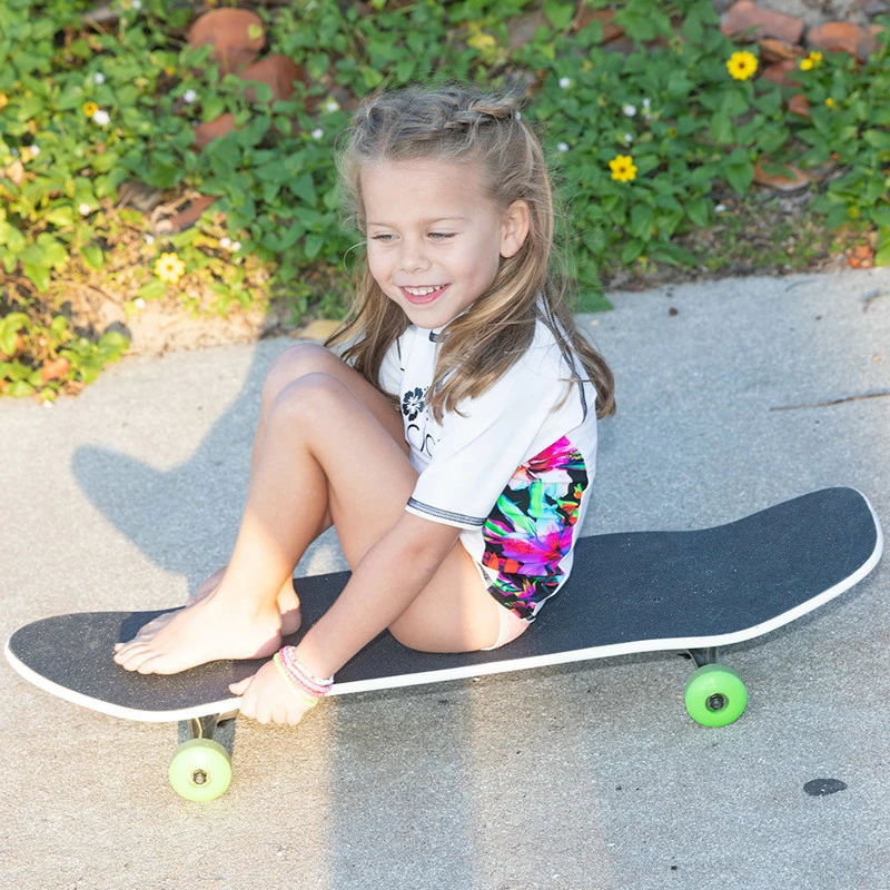 Protect your little one from harmful UVA & UVB rays with the Ron Jon Kids White Hibiscus Rash Guard. It features a hibiscus logo front screen print and floral side panels.