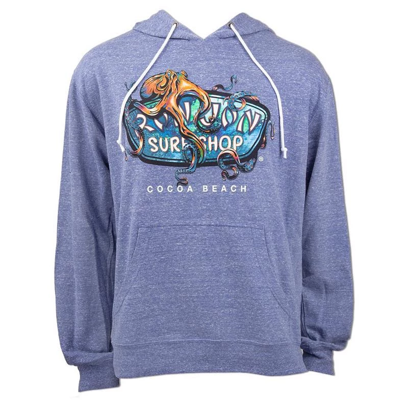 The lightweight Ron Jon Kraken Fun Pullover Hoodie features a colorful Trusty Badge with an octopus wrapping itself around it.
