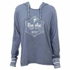 If it’s not cold enough to wear a jacket, but not warm enough to wear a short sleeve tee, then the Ron Jon Ladies Serenity Long Sleeve Tee Hoodie is the perfect option for you! It features a light cotton polyester blend fabric, drawstring hood, and adorable striped cuffs.