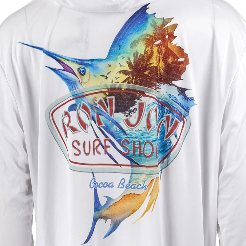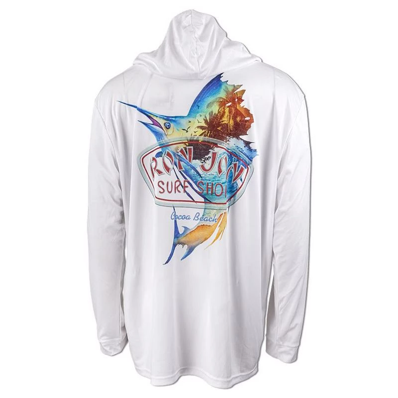 Take to the seas in this UPF 50+ rated long sleeve hooded shirt from Ron Jon Surf Shop. Whether you are battling a big catch, like the sailfish in the shirt’s graphic, or just running errands, you are sure to appreciate the extra protection from the sun’s rays that this shirt offers.