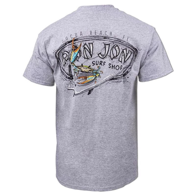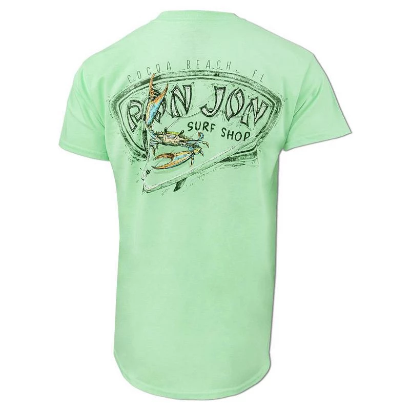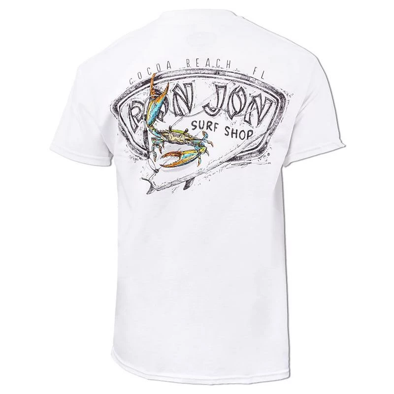 The Ron Jon Surf Crab Tee features a large hand-drawn back graphic of our famous logo with a colorful crab hanging out on a surfboard. The same hand-drawn logo is featured on the left front chest with a shout-out for “Cocoa Beach” on both sides.