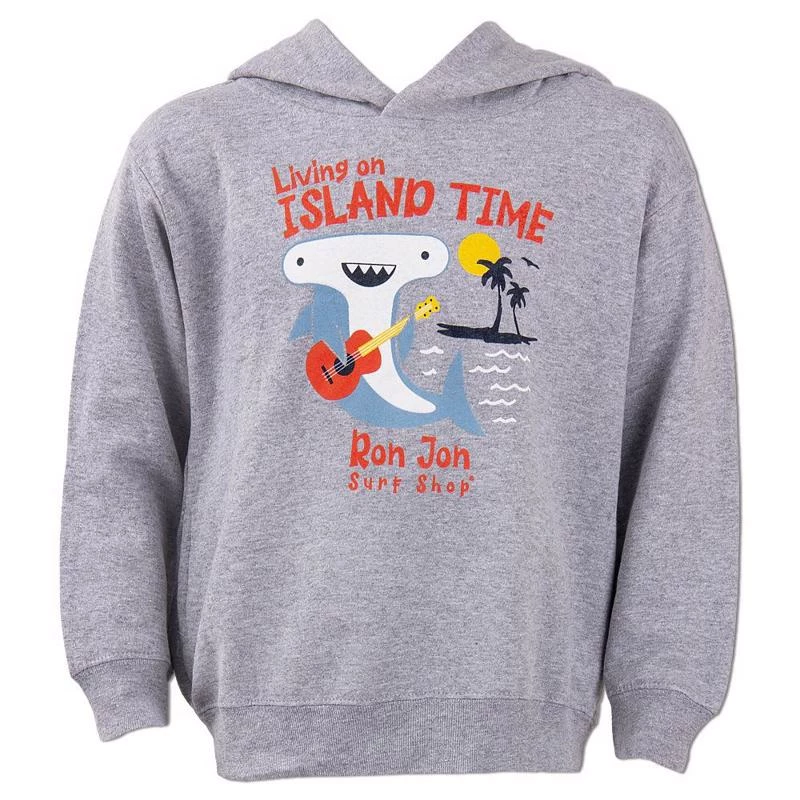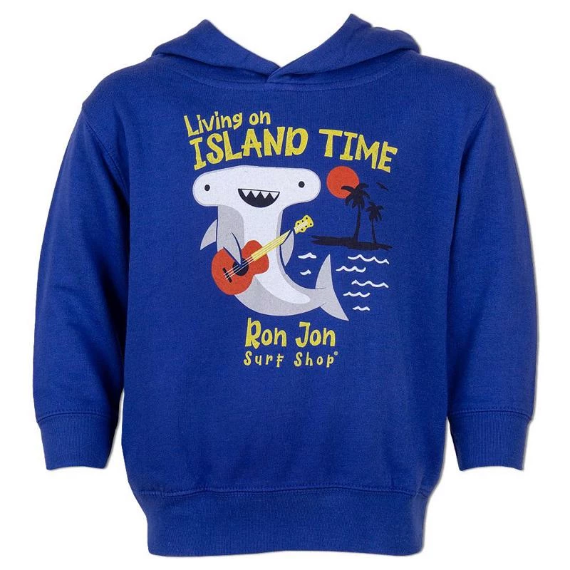 The Ron Jon Toddler Shark Guitar Pullover Hoodie features a happy hammerhead shark playing a little tune near a tropical island with the words Living On Island Time Ron Jon Surf Shop above and below it.