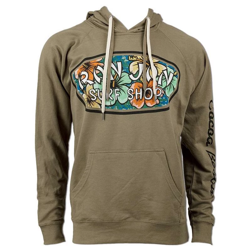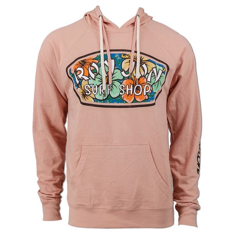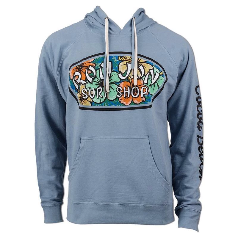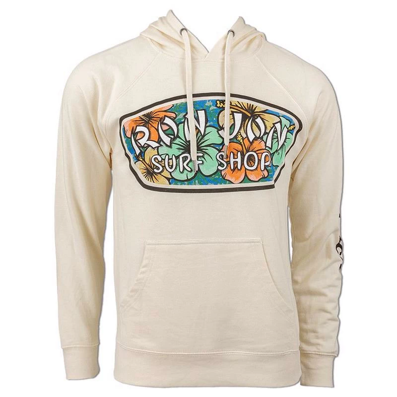 The Ron Jon Hibiscus Badge Pullover Hoodie features a pretty floral design within our world famous badge shaped logo.