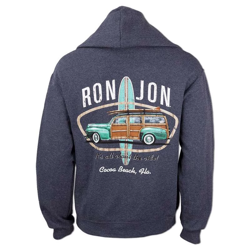 This hooded sweatshirt from Ron Jon is part of the Vintage Woody collection. It features a large decal on the back of the shirt with a large surfboard, in front of the board is a classic woody.