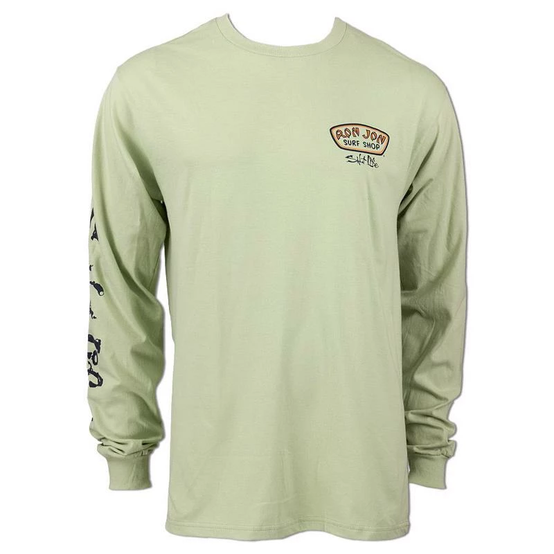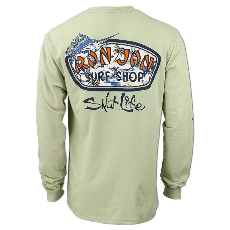 Salt Life Ron Jon Long Sleeve Sea Escape Tee is a collaboration t-shirt featuring the Ron Jon Surf Shop and Salt life logo and an ocean screen print graphic.