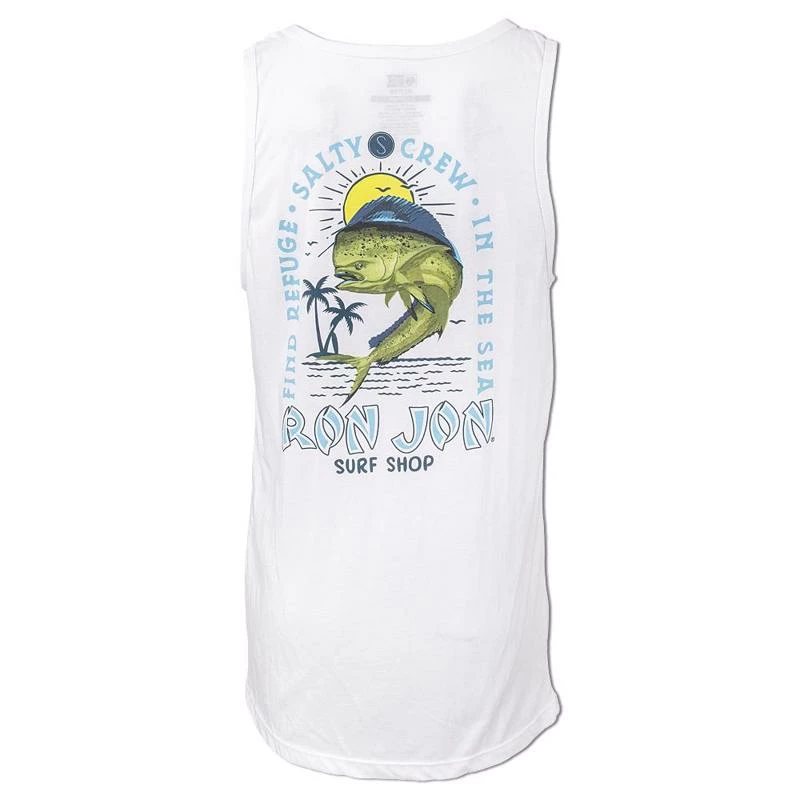 The Mahi Mayhem collaboration tank top from Salty Crew and Ron Jon Surf Shop features a large back graphic of a Mahi fish jumping with the sun in the background. Around the graphic is the phrase “Find Refuge In The Sea” as well as both company names. Smaller version on the front.