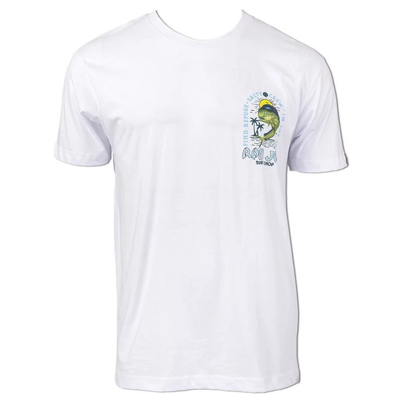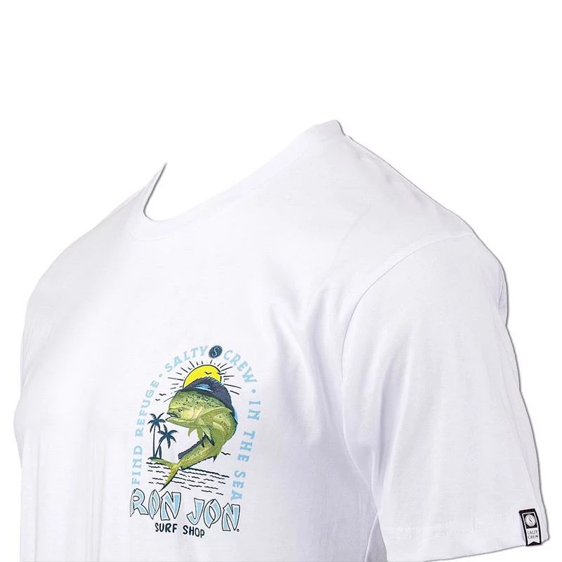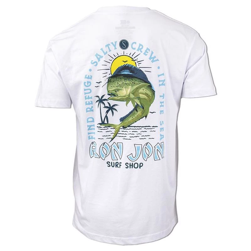 The Mahi Mayhem collaboration short sleeve t-shirt from Salty Crew and Ron Jon Surf Shop features a large back graphic of a Mahi fish jumping with the sun in the background. Around the graphic is the phrase “Find Refuge In The Sea” as well as both company names. Smaller version on the front.