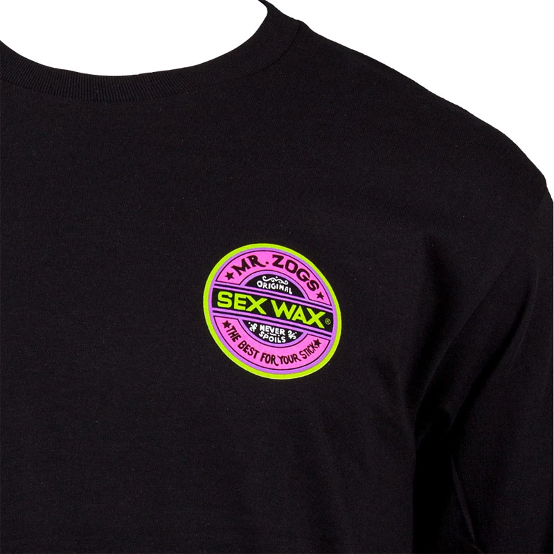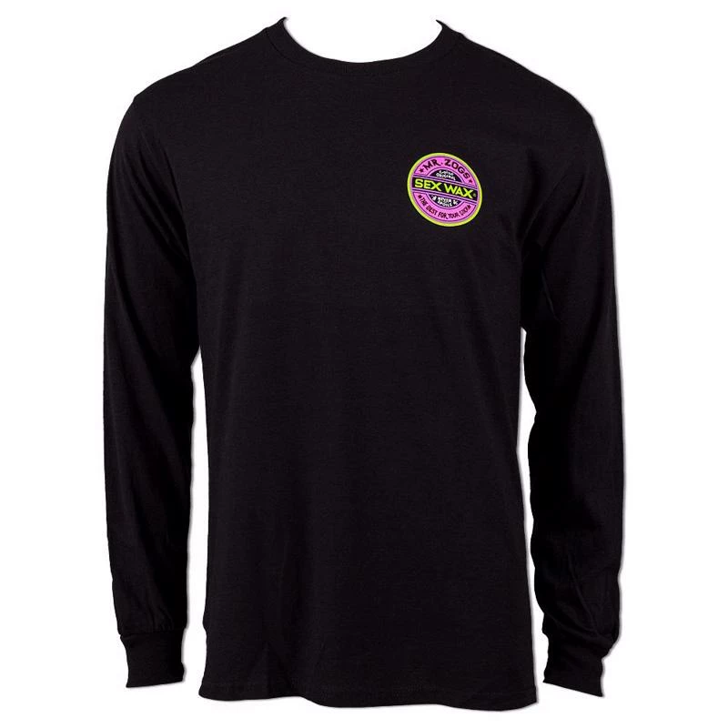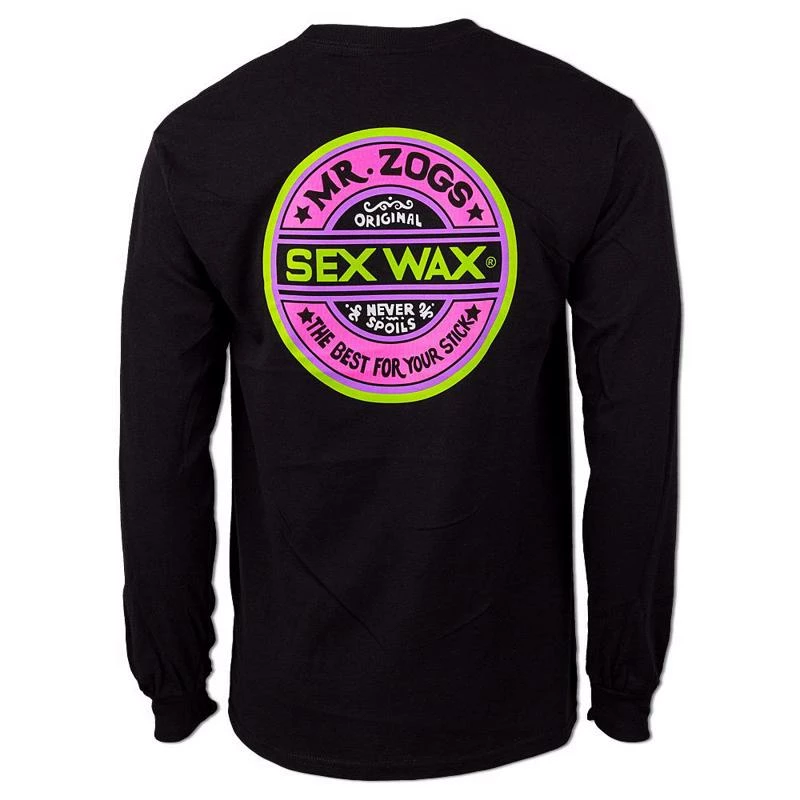Reminiscent of the blacklight artwork from the ’60s and ’70s, this long-sleeve t-shirt features the Mr. Zogs Sex Wax logo with a bright neon fluorescent color background. Large version on the back, smaller version on the front.