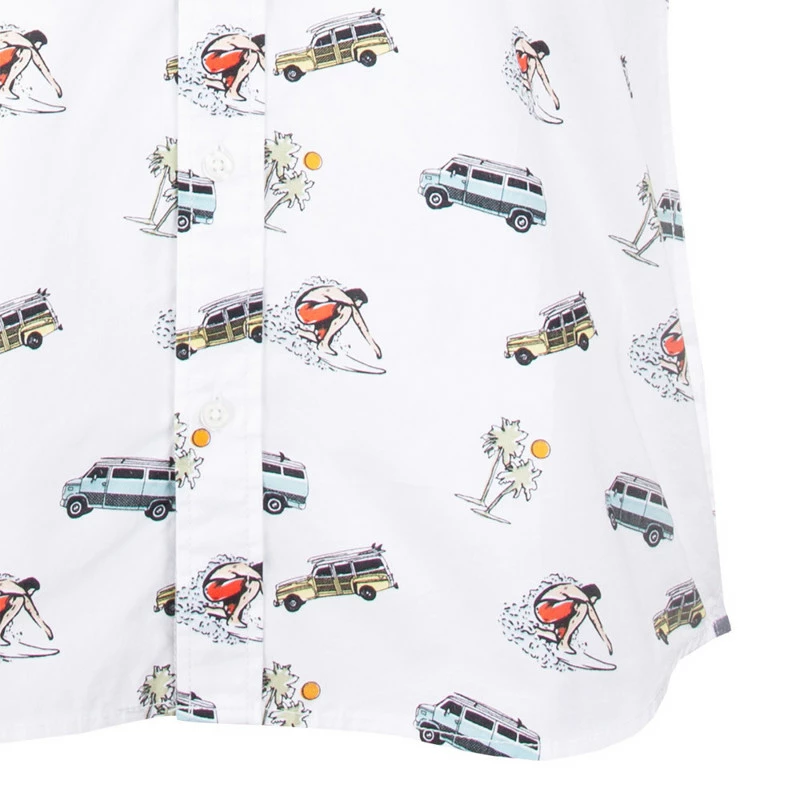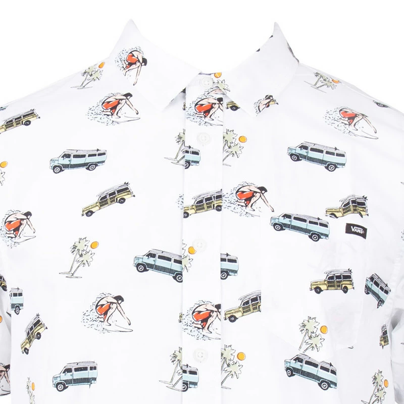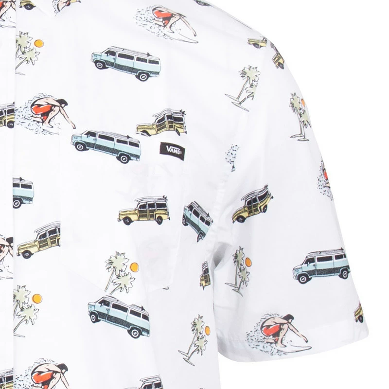 The Vans Ron Jon Full Day Short Sleeve Shirt is the perfect shirt for any occasion. It features surfers catching waves, sunny beaches, and classic surf cars like the classic woody.